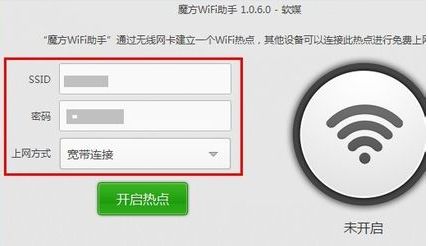 3.在这个界面点击启动魔方wifi助手,启动后,在文本框中输入wifi网络的SSID和无线网络密码,然后选择上网方式,也就是当前您的电脑连接的网络。