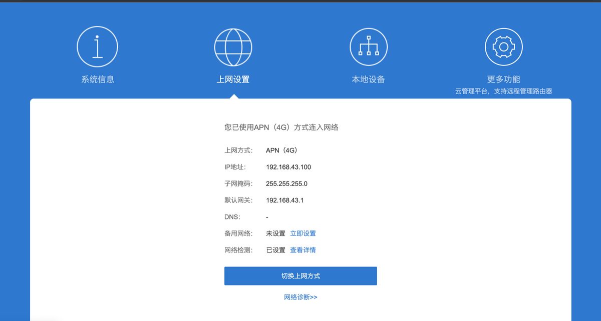 它配置的方式很简单,直接插入4G卡,连接电源和路由器发出的WiFi信号,进入后台管理界面即可进行各种常规的设置。APN(4G)模式就是4G上网模式,直连即可,宽带的话还是要按照传统的输入账号密码拨号使用。