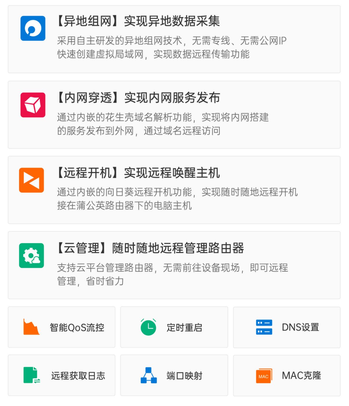 蒲公英R300A 4G工业路由器支持强大的组网功能,无需专线,无需公网IP,快速创建虚拟局域网,完美实现数据远程传输功能。如果是做远程运维的,通过蒲公英R300A 4G工业路由器辅助就很实用了,远程进行网络设备管理没问题。