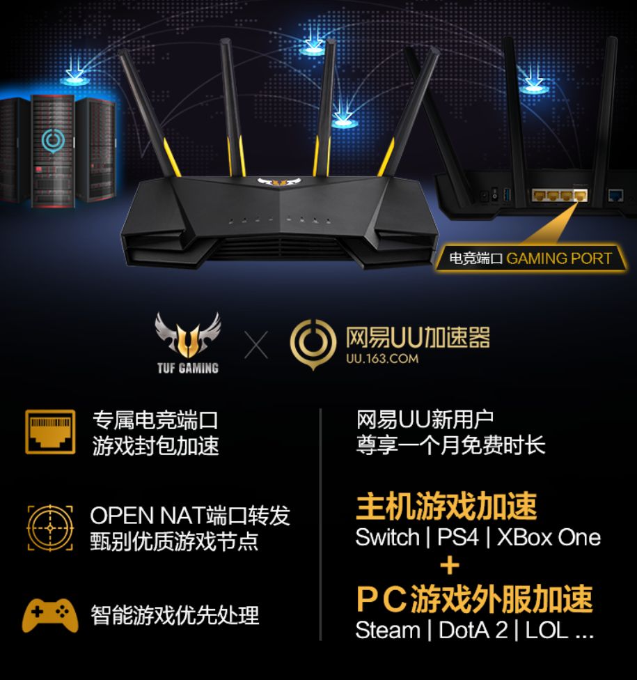 作为游戏路由那么就一定有专属的游戏加成,TUF GAMEING AX3000提供了多重游戏加速,除了企业级的游戏封包过滤机制以及智能QoS,还配备独有的游戏专用网络接口,优先处理与其连接设备的游戏数据包,大幅降低链接速度和延迟,带来流畅的游戏体验;内置网易UU加速器,本土化技术更适合国内玩。