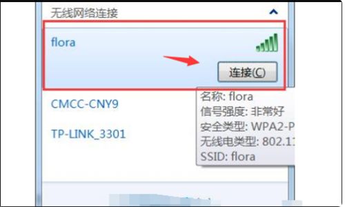5、最后,现在刷新无线列表,找到刚刚设置的无线网络(flora),再单击“连接”完成设置,如下图所示。
