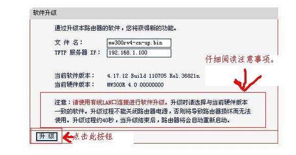 可以用路由器自带的升级工具升级,找到系统工具后,点击软件升级,此时单击升级按钮即可。
