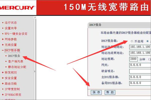 6、进入到该路由器后台以后点击DHCP服务,勾选DHCP不启用的按钮点击保存。