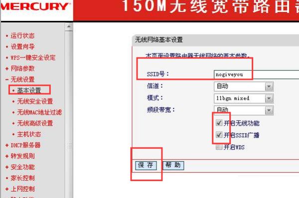 7、再点击无线设置,选择基本设置,在设置界面中输入需要的无线信号名称勾选开启无线功能和无线广播点击保存。
