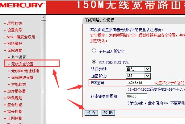8、再点击无线安全设置,在设置界面中输入该无线信号的密码点击保存。