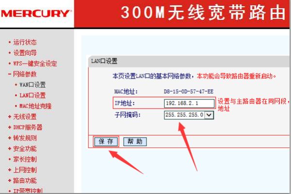 9、点击网络参数下面的LAN口设置。将其IP地址修改为不同于前面看到的路由器网关点击保存。