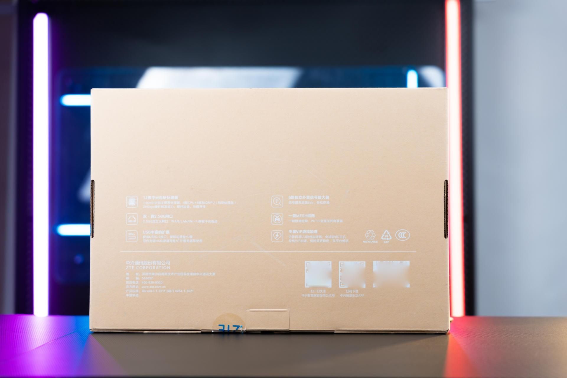 外包装方面非常的朴素,一个纸皮的盒子外面带有路由器外观的简约线条,非常有中兴的低调感觉。中兴也不用多介绍了,国产的路由器龙头品牌了,我们平时使用的很多的光猫,或者家用宽带电缆都是中兴这一家公司提供的解决方案。