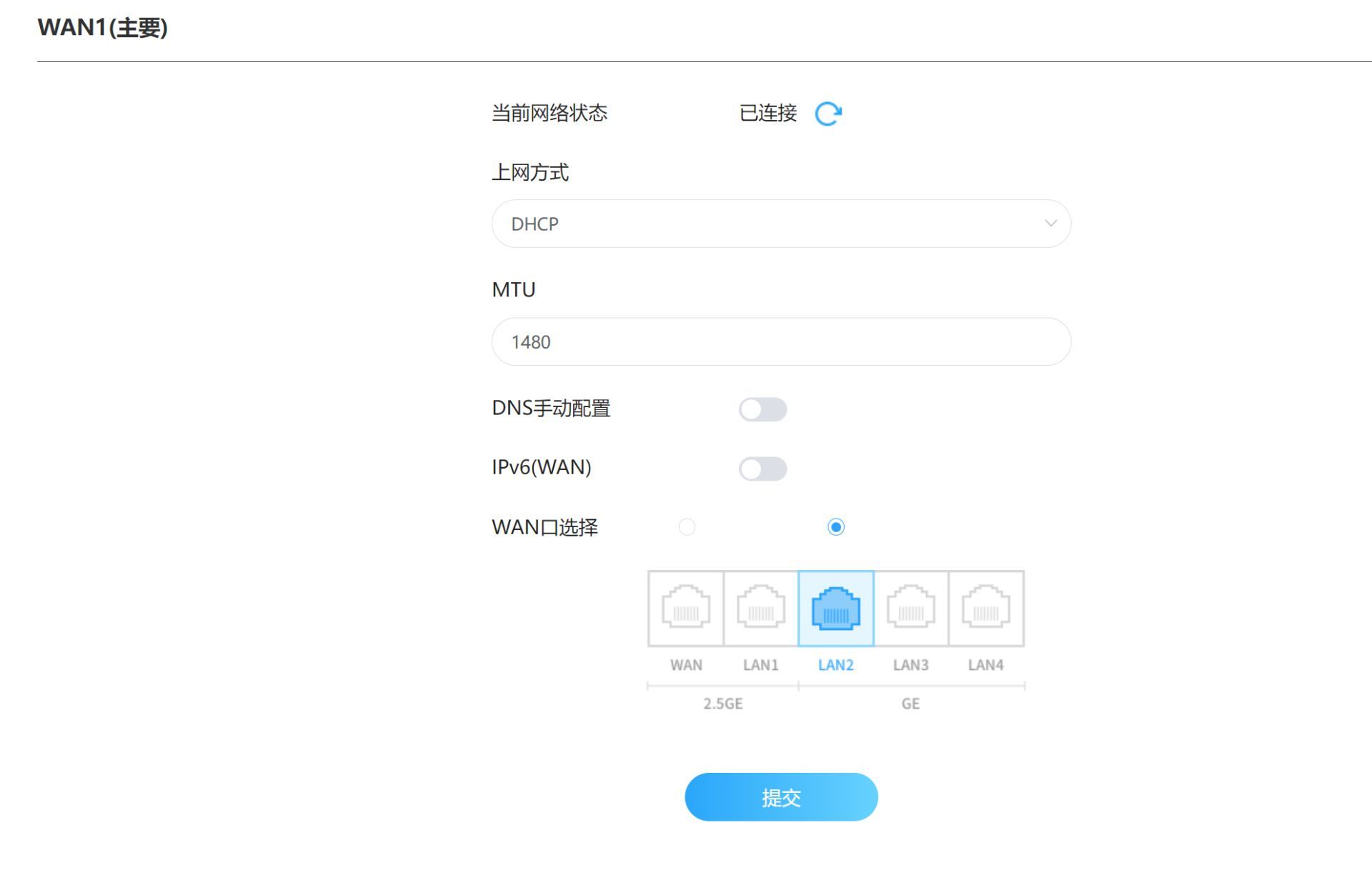 这个时候我发现了一个很狗的事情,这一个路由器居然其中一个2.5就是WAN,也就是说连接光猫就占用了我一个2.5G网口,而其余的接口都标注着LAN口,还好我在设置里面找到了可以把其中一个LAN口设置为WAN口,那么两个2.5G接口就能空出来了!中兴牛逼!