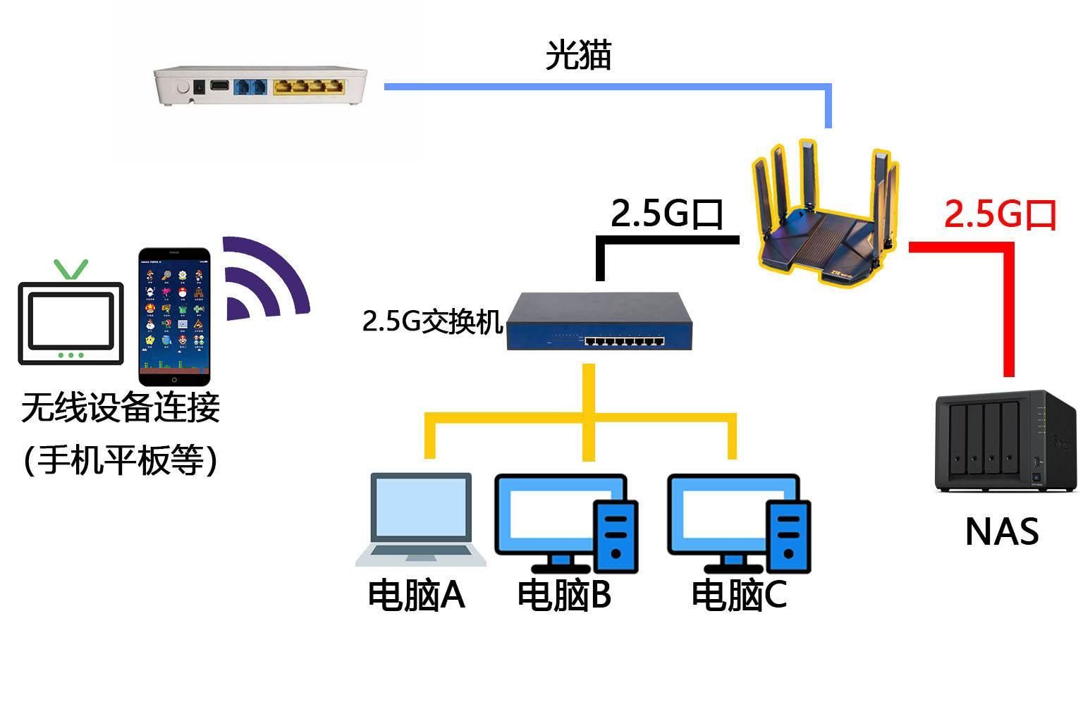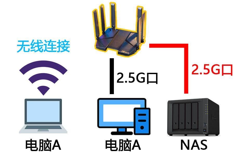 简单来说这款路由器我最常用的方案:就是直接通过NAS连接路由器,然后其他的无线设备,就能通过这一个2.5G的网口来访问NAS里面的文件,能轻松跑到200~300兆每秒的速度,这样的话是非常的方便的,在文件传输的过程中再也不需要额外插网线了。