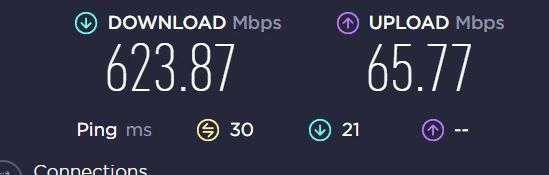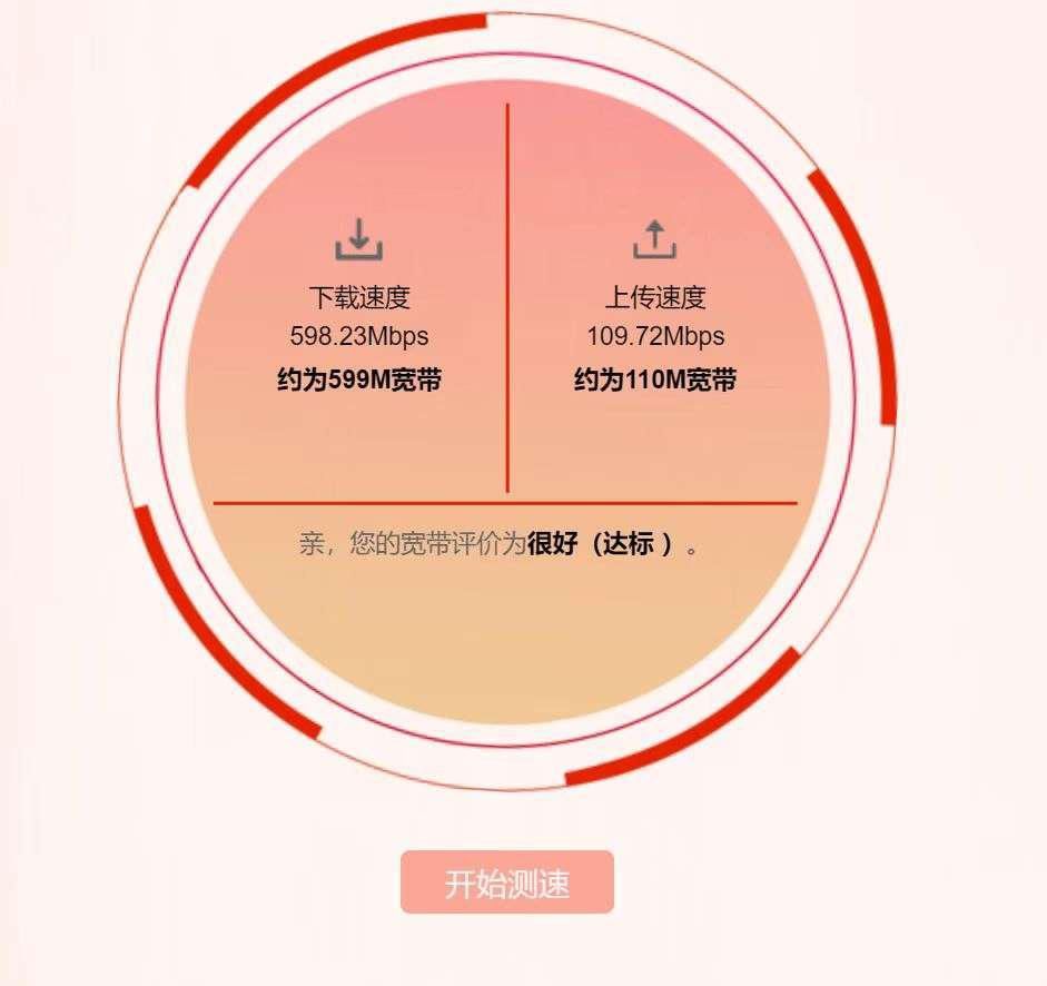我这里家用的宽带是联通的500兆宽带。使用这一个路由器简单进行测试,能够轻松跑到599Mbps下行,上行也有110Mbps左右,可以说是跑满我的宽带。
