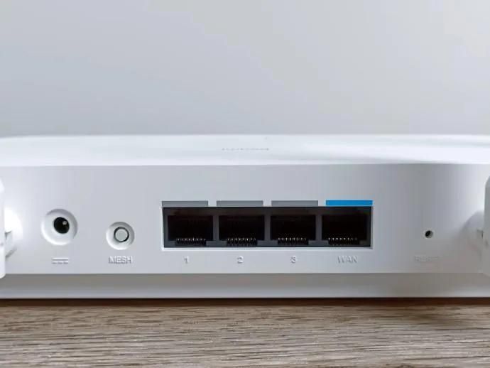 路由器前面板的设计和AX5相同,上方有两个显示运行状态的指示灯,指示灯周围有大量的开孔,保证空气流通,起到最佳的被动式散热效果。下方印有路由器的网络名称、IP地址、部分规格以及用于挂墙的凹槽。尾部提供1个千兆WAN自适应网口和3个千兆LAN自适应网口,自带RESET按钮以及一键Mesh按钮,可以方便地搭建Mesh网络。除此之外,还有四根外置天线,可配合位置不同,旋转调整角度。