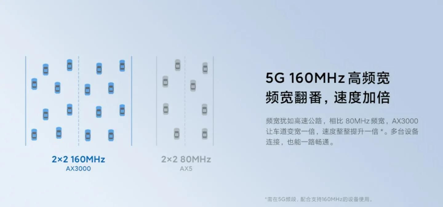 上一代的Redmi AX5就支持WiFi6网络,但只支持20/40/80MHz频宽,缺少了160MHz。所谓频宽,是发送无线信号频率的标准,曾经主流的2.4GWiFi支持20/40MHz频宽,而5GWiFi则支持20/40/80/160MHz。我们可以把160MHz比作8车道,那对应的80MHz就是4车道,而40MHz 和20MHz就只有2车道和单车道了。因此160MHz可以带来更大的数据流容量和交换速度。反馈到消费者身上,就是APP中的内容能够更快地呈现在眼前。