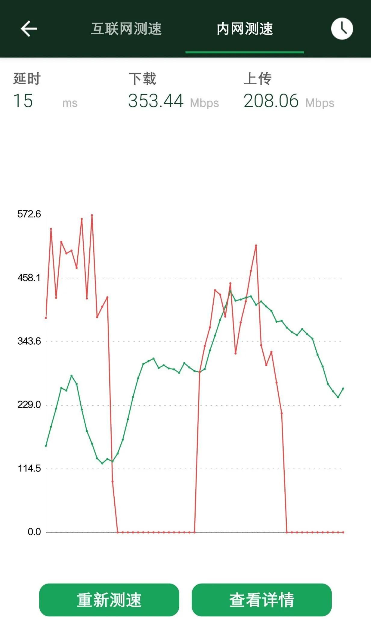 我们再来测试一下内网网速,我们在电脑和手机之间传输一个大文件,分别测试上传和下载速度。最后测试下来下载平均354Mbps,上传平均208Mbps,最高速度达到过572Mbps。