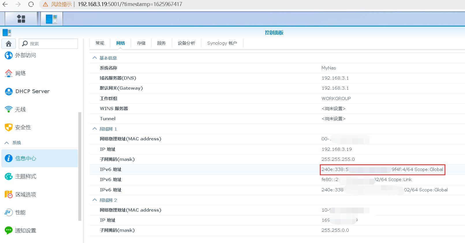 接着打开群晖系统,进入控制面板-信息中心-网络查看IPV6地址。圈出来的就是群晖的IPV6地址,/64后面的都不要。