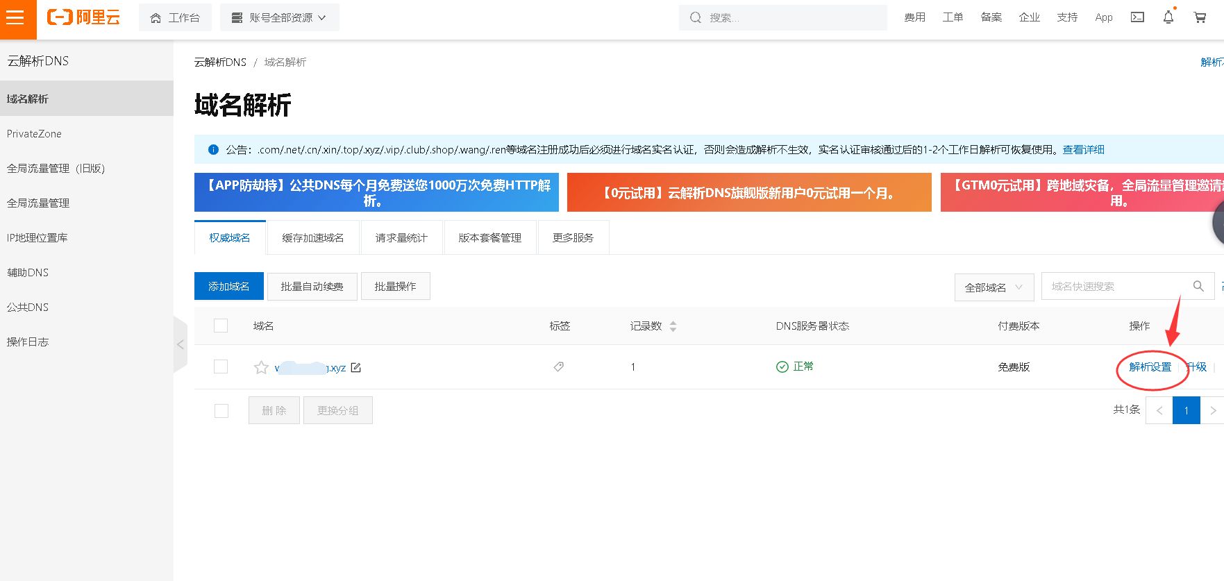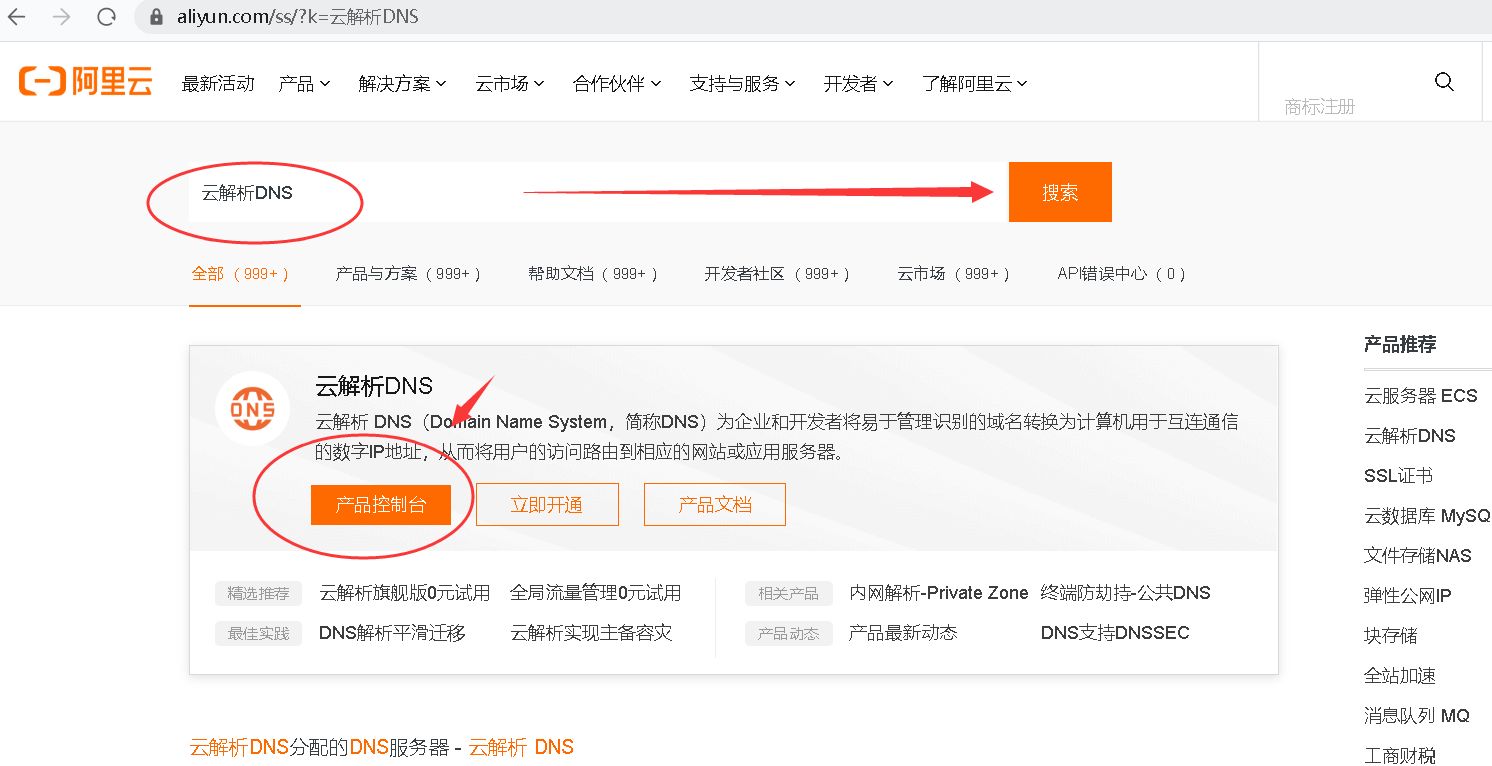 登录阿里云,直接搜索 云解析DNS,进入产品控制台,
