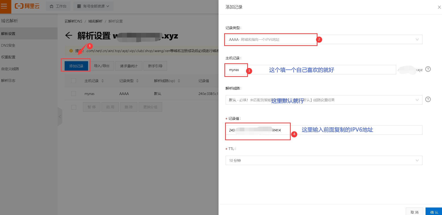 aliddnsipv6_name1:填写刚刚手动解析AAAA的主机记录的值。比如mynas或者abc,根据自己喜好。