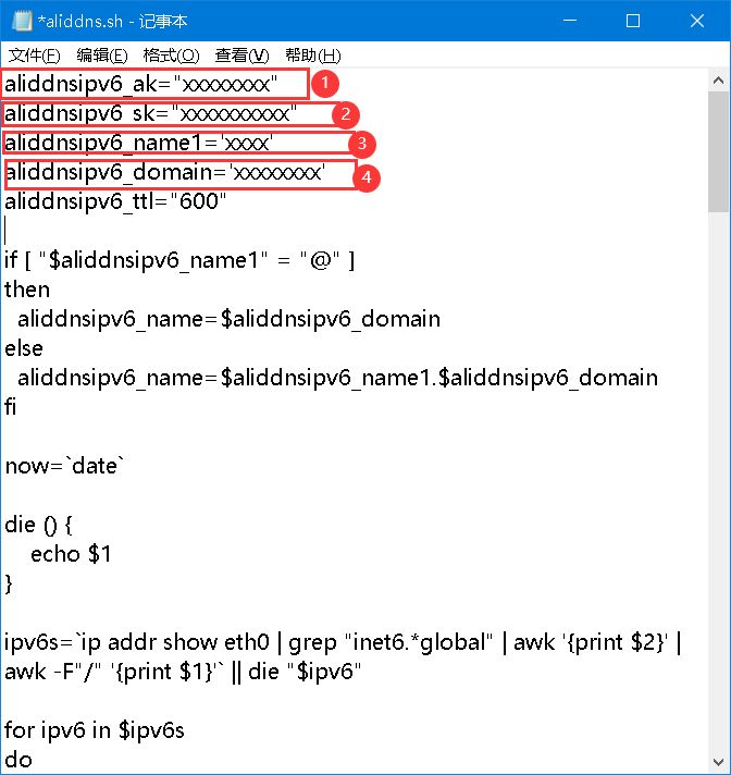 接着用记事本打开脚本文件aliddns.sh,这里我们需要填写1-4行的值
