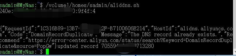 在PuTTY里面输入位置地址/volume1/homes/sadmin/aliddns.sh 回车,运行成功会出现群晖的IPV6地址。出现下面这个界面说明运行成功。如果出现的不是图片上的内容,重新核对下自己是哪一步不对或者输错了没有。