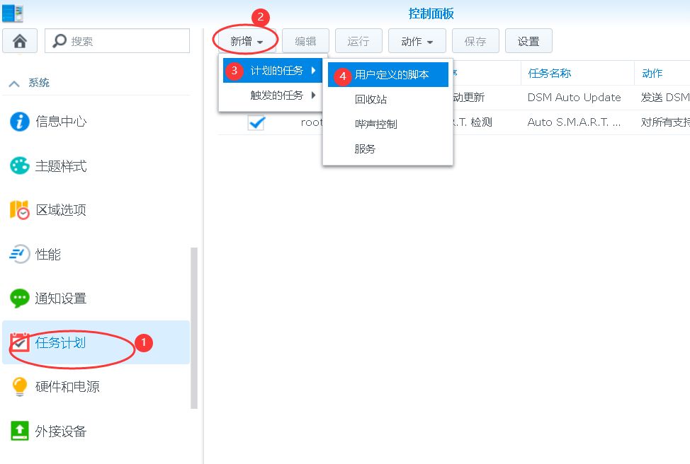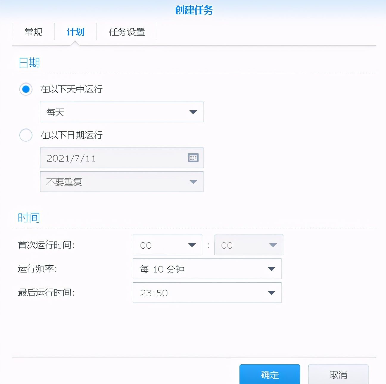 接着在群晖里面添加一个计划任务。控制面板--任务计划--新增--计划的任务--用户自定义的脚本,然后创建任务。计划里如图设置好后,在任务设置界面运行命令下面填入aliddns所放的位置。然后确定。