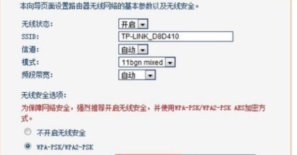 9.然后下一步后进入到的是无线设置,可以看到无线状态(调为开启)信道(设为自动)、模式(通常选11bgn)、安全选项(选wpa-psk/wpa2-psk,这样安全,免得轻易让他人破解而蹭网)、SSID(就是指WIFI名字,你自己设置就好了)。