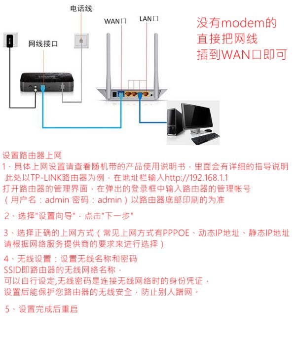 无线路由器插上电,先不要接猫,电脑连接无线路由器任一LAN口 , 浏览器输入192.168.1.1 进入设置页面,按照PPPOE(ADSL虚拟拨号)方式设置即可。 然后 再设置一下SSID、加密方式和密码 。 保存、重启。 设置好以后,把猫LAN口接出来的网线接在无线路由器的WAN口上