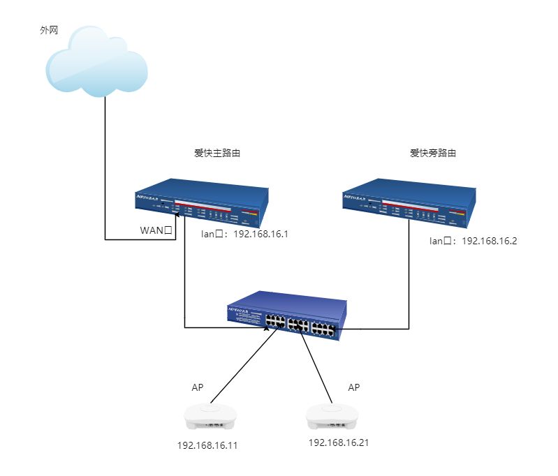 举例说明:某公司需要主路由上网,旁路由来管理ap。以下是拓扑图: