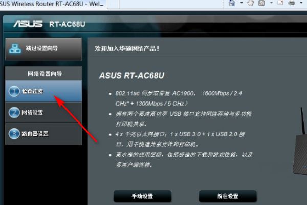 5、重新打开AC68U欢迎页面,设计的初衷是通过向导启动路由器,检测上网类型并设置无线网络。