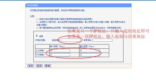 4、添加要分网速的IP地址,设置好网速的下载(下行带宽)与上传(上行带宽)速度,点击保存。