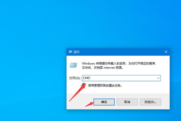 2、在出现的对话框中输入CMD点击确定。