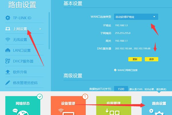 5、进入到路由器后台以后点击路由设置。然后选择上网设置,将其WAN口连接类型设定为自动获取IP地址,点击保存。