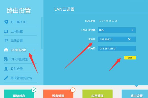 7、点击LAN口设置,将其IP地址修改为不同于光猫的IP地址并点击保存。