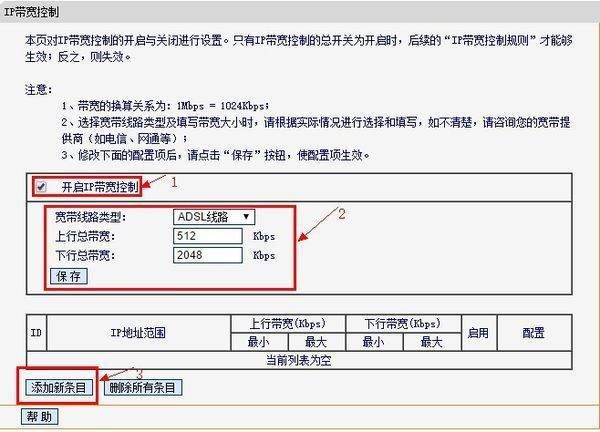 5、接下来就能真正开始路由器的限速设置了,在打开的界面中,首先需要开启“IP带宽控制功能”,然后填写自己的网络总带宽,