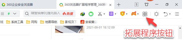 一、打开360浏览器,浏览器的右上方有个四方块按钮,那就是拓展程序按钮(如图)。