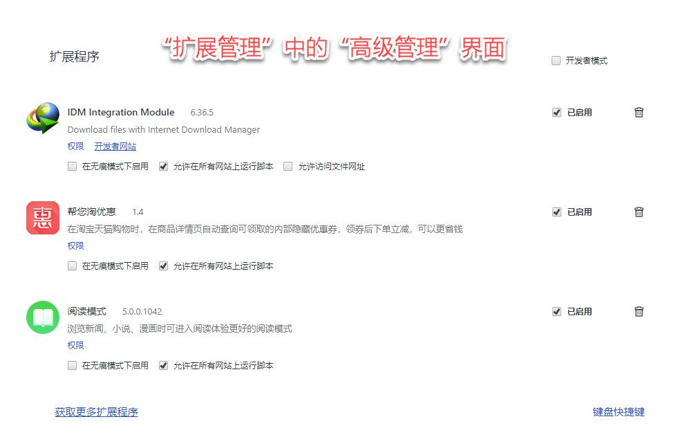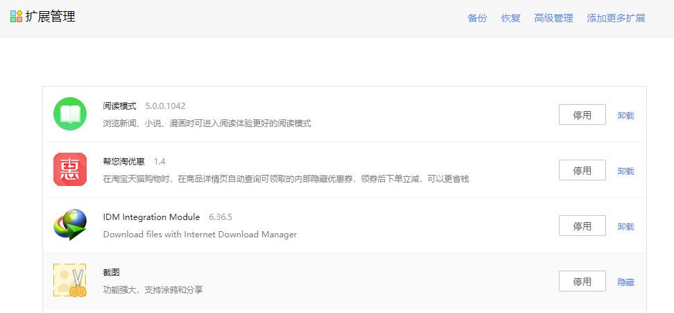 界面中还有“管理”按钮,点击后出现扩展管理界面,就可以选择启用、停用、卸载、隐藏某个拓展程序的选择。扩展管理界面还有“高级管理”按钮,也提供对一些扩展应用程序的管理。