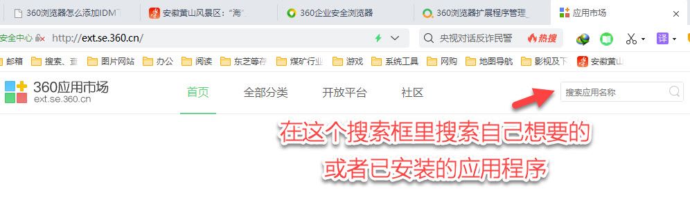 三、在添加拓展程序界面,点击“添加(+号)”,就会出现“360应用市场”页面,在此页面中右上角有一个搜索栏“搜索应用名称”。