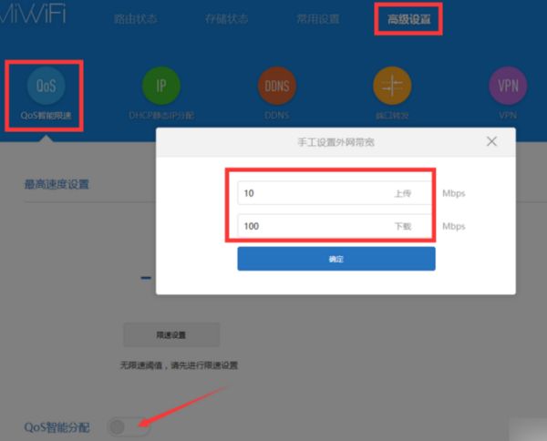 1、首先,需要进入路由器后台管理界面,在此以小米路由器为例,切换到“高级设置”-“QOS智能限速”选项卡,点击“QOS智能分配”右侧的“开关”,此时将弹出“手动设置外网带宽”窗口,输入相应的“上行”和“下行”带宽,点击“确定”按钮即可开启。