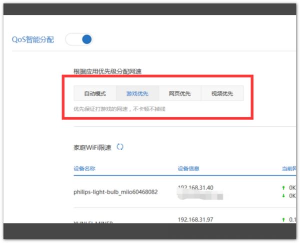 2、在“QOS智能限速”模式下,小米路由器提供了“四种”优化网速的场景模式。“自动模式”、“游戏优先”、“网页优先”和“视频优先”模式,这可以根据自己的实际使用场景进行选择。