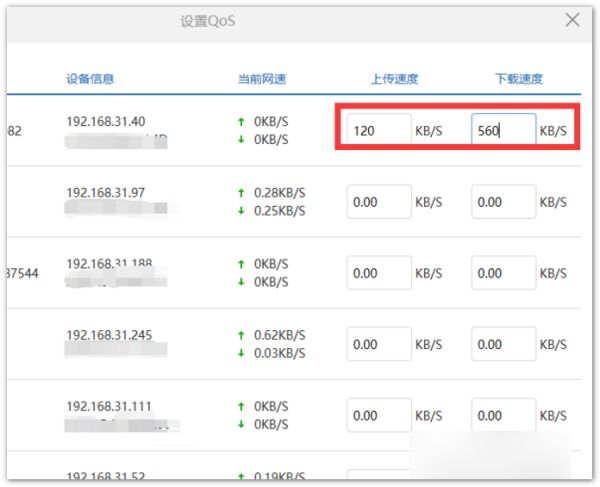 3、当然,我们也可以手动设置QOS实现限速功能,点击“设备列表”最下方的“编辑”按钮,即可弹出如图所示的“设置网速”界面,在此直接根据设备号设置相应的“上行”和“下行”网速即可。