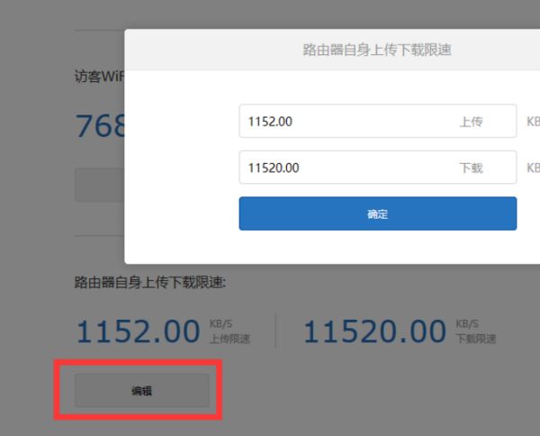 4、同时我们还可以针对“路由器自身上传和下载”进行限速,针对访客模式进行限速。点击相关的“编辑”按钮,即可设置“上行”和“下行”速度。