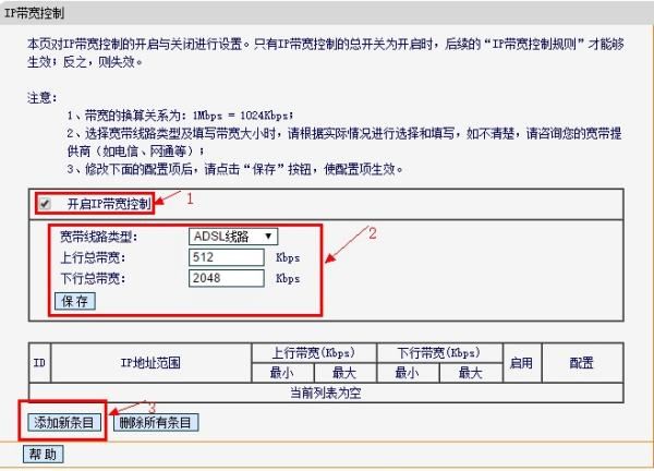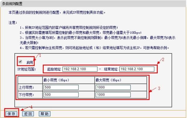 8、再在下面的规则中填写要控制的IP和带宽大小,同时也设置自己的电脑“保证最小带宽”,并且全部选择“启用”,再单击“保存”按钮保存全部的设置即可。