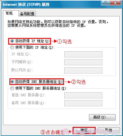 3、选择“自动获得IP地址”和“自动获得DNS服务器地址”——>点击“确定”。