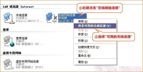1、右键点击“无线网络连接”,选择“查看可用的无线连接”