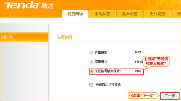 2,此时会弹出一个设置向导,选择”信号放大“(这个是通过WIFI功能连接上一层路由器WIFI)——点”下一步“,