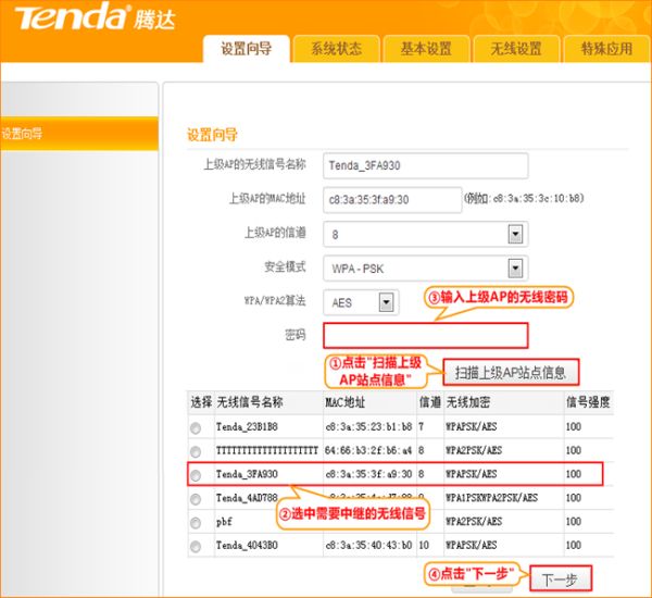 3、点击“扫描上级AP站点信息”——>选择需要放大的无线信号——>输入需要放大的无线信号的连接密码——>点击“下一步”。