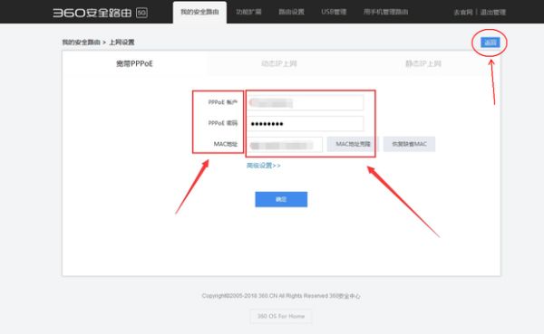 5、根据网页的提示,选择上网的方式,举例选择宽带的上网方式,并且填好账户信息,设置成功之后,点击“确定”选项,下一步在选择页面右上角的“返回”选项,单击鼠标左键,如图所示。
