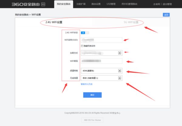 7、进入WiFi设置的页面之后,根据自我需求,选择2.4G WiFi设置或是5G WiFi设置,再依次填写WiFi的信息,填好之后,点击“确定”即可,如图所示。