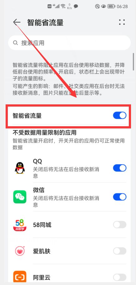 然后点击“智能省流量”,在智能省流量界面,开启“智能省流量”的开关,把它变成蓝色,如下图所示。