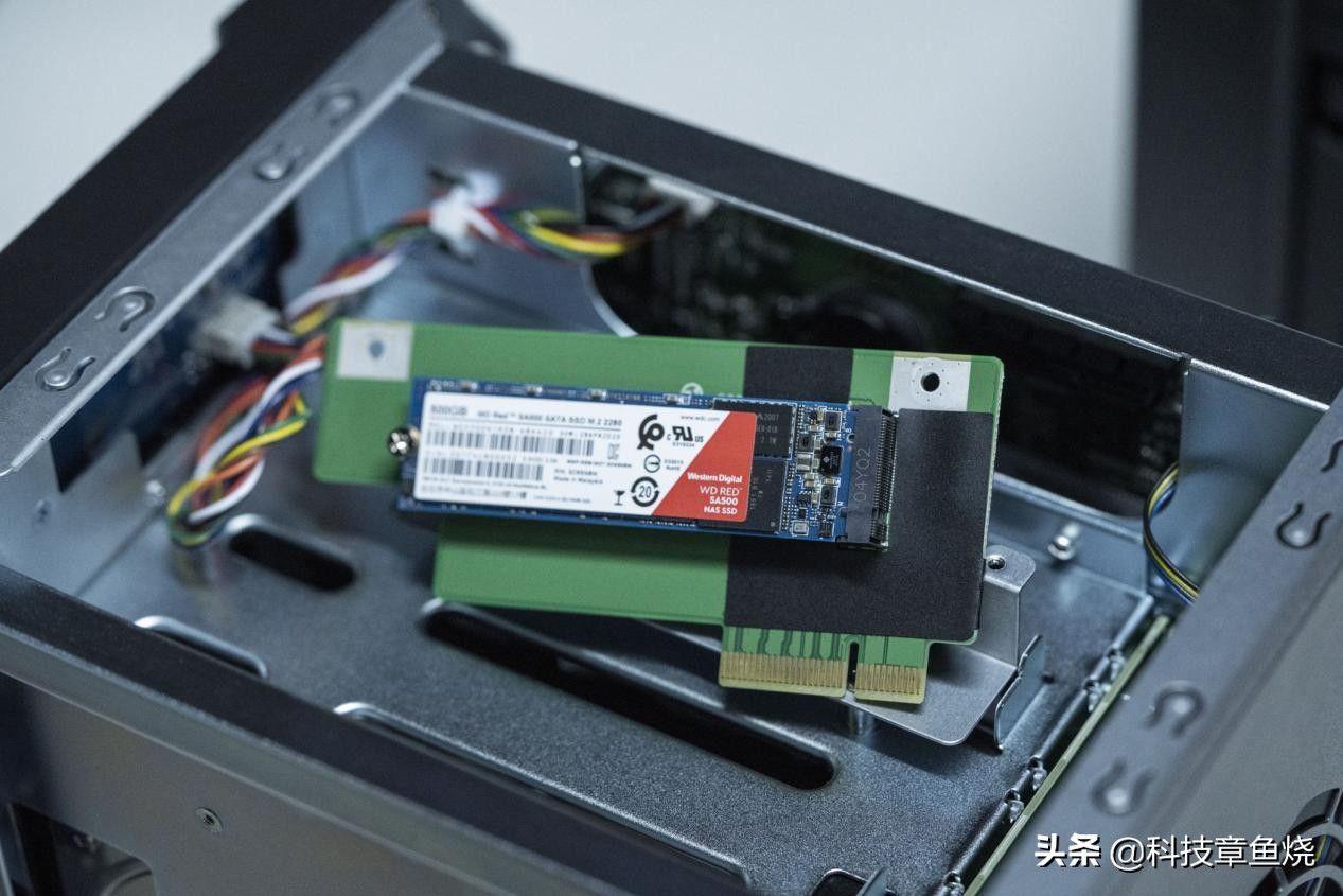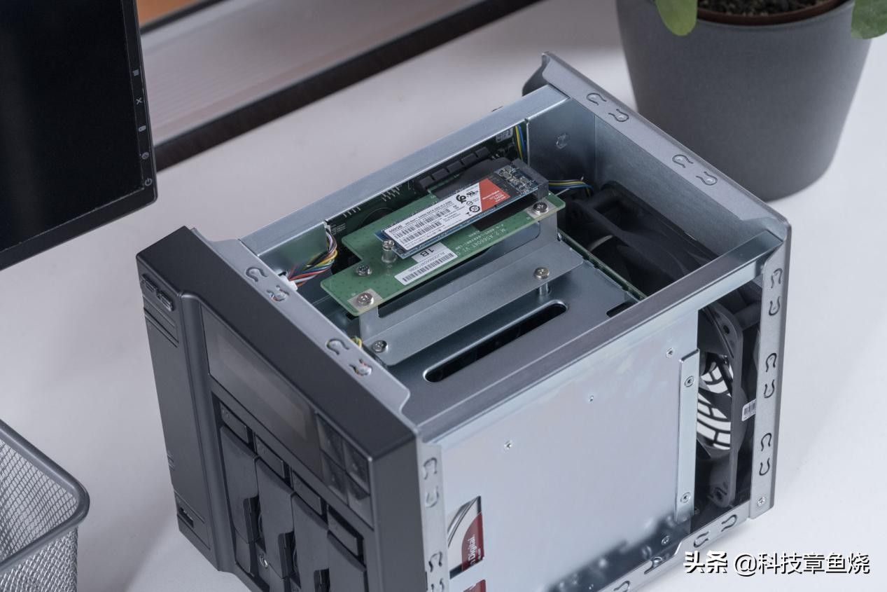 卸下背部的三颗螺丝之后,便可以将金属外壳滑出来并查看华硕AS6604T隐藏的两个硬盘位。是的,华硕AS6604T算是同价位内少数支持双M.2 SSD硬盘安装的NAS设备,主要用途是为了提升存储盘的读写速度,当然你也可以用于存储或系统。