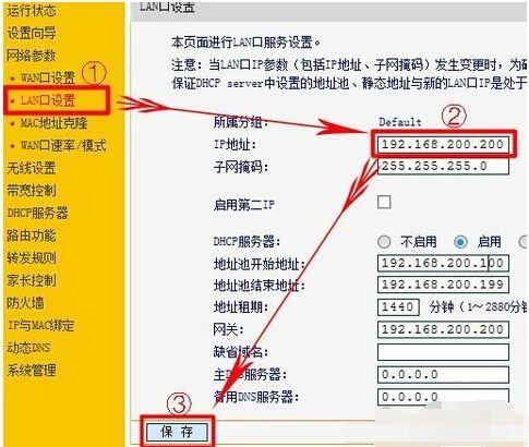 ③、修改路由b的lan口ip地址(不要与路由器a的网段相同即可),修改IP为192.168.200.200.
