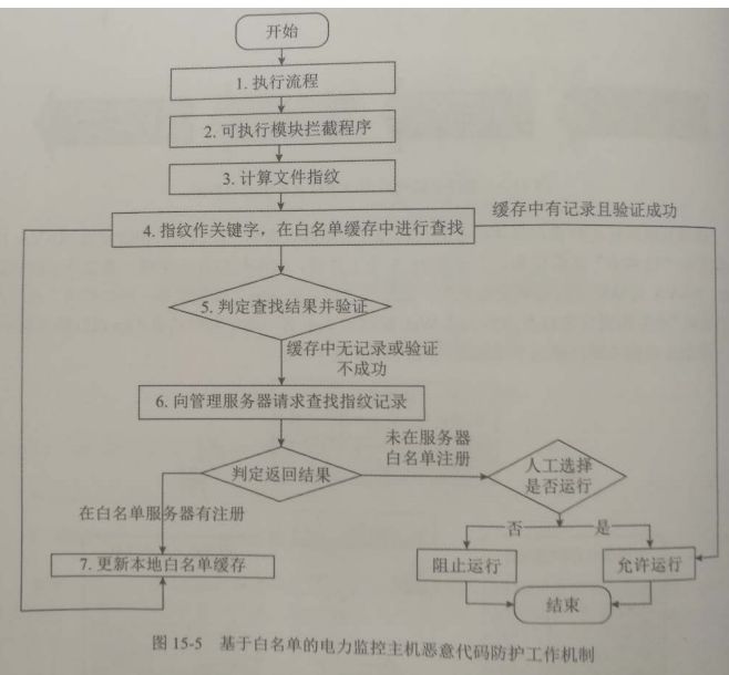 传统的杀毒软件基于黑名单(病毒特征库)匹配来防范恶意代码,由于病毒特征库的大小和覆盖攻击方法的局限性,其对新的零日漏洞的恶意代码难以查杀。利用软件白名单技术,只允许可信的软件安装和执行,可以阻止恶意软件安装到目标主机,同时阻断其运行。电力监控主机软件简单、更新变化小,从而适于用软件白名单管理,国内研究人员提出了基于白名单的电力监控主机恶意代码防护技术方案,如图所示